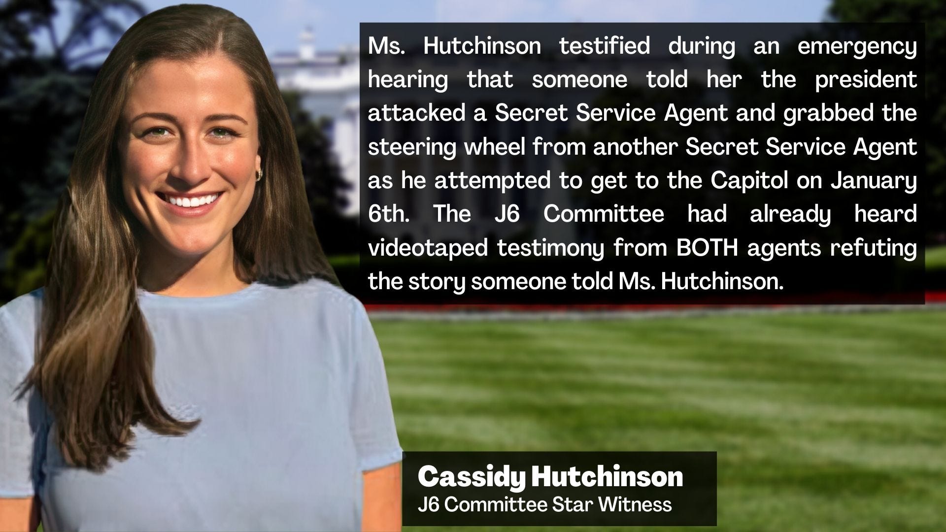 If you needed any more proof that the J6 Committee is corrupt you need to look no further than yesterday’s ‘emergency hearings’ where Cassidy Hutchinson testified that she was told that President Trump attacked a Secret Service agent and grabbed the steering wheel of a vehicle being driven by another Secret Service agent.1 Ms. Hutchinson failed to bring up ANY of this information during her first appearance before the committee - suddenly she ‘remembers’ this fantastic new story that has never been reported before.