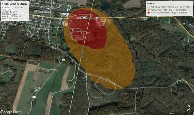 Authorities made the decision to burn the vinyl chloride to prevent it from exploding.5 Shortly before the controlled burn the governor released the following map to help residents understand the risks of remaining in the area. Red = Death and Yellow = Serious Injury.