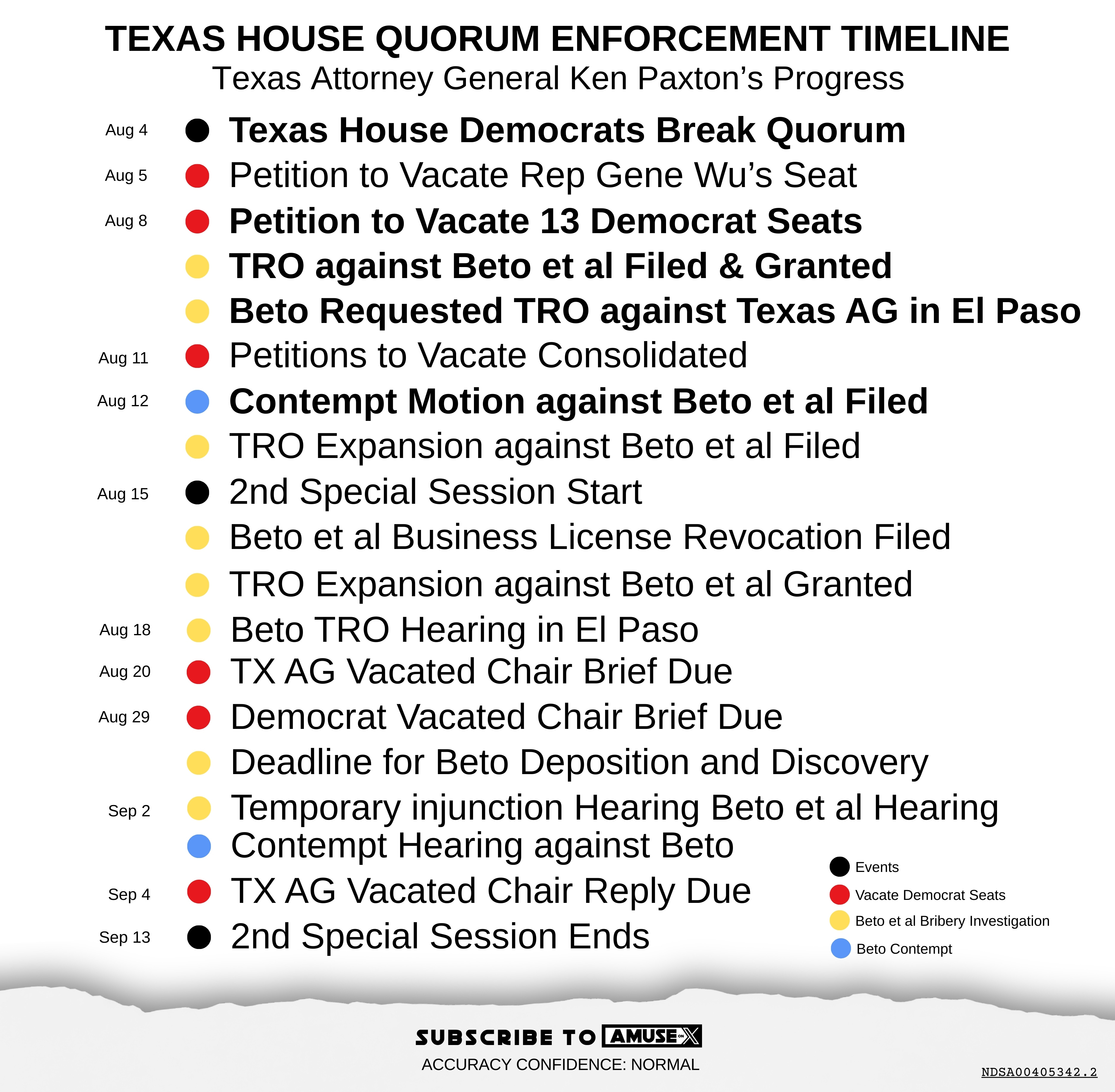 By mid-August, Paxton secured an expansion of the restraining order and moved to revoke business licenses associated with Beto and his network. On August 15, the same day the second special session began, he pushed further still, opposing Beto’s attempt in El Paso to halt his bribery investigation. The court ordered Beto to sit for a deposition and provide discovery by August 29. Paxton is playing a long game, striking at the walkout’s financiers while pursuing legal accountability for the walkout itself.