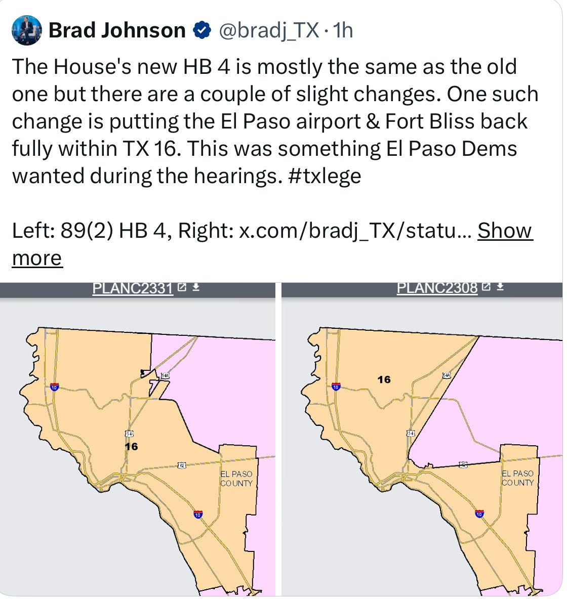 Meanwhile, the redistricting fight that prompted the Democratic exodus continued. The initial map proposed in the first special session shifted key portions of Fort Bliss from Democrat Veronica Escobar’s 16th District into Republican Tony Gonzales’s 23rd District. The second-session map reversed course, returning Fort Bliss and El Paso International Airport to Escobar. On its face, this looked like a concession to Democrats, fueling suspicion that the walkout had been rewarded. Representative Brian Harrison voiced the sentiment bluntly, accusing leadership of bending to Democratic demands while ignoring Republican calls to maximize GOP gains.