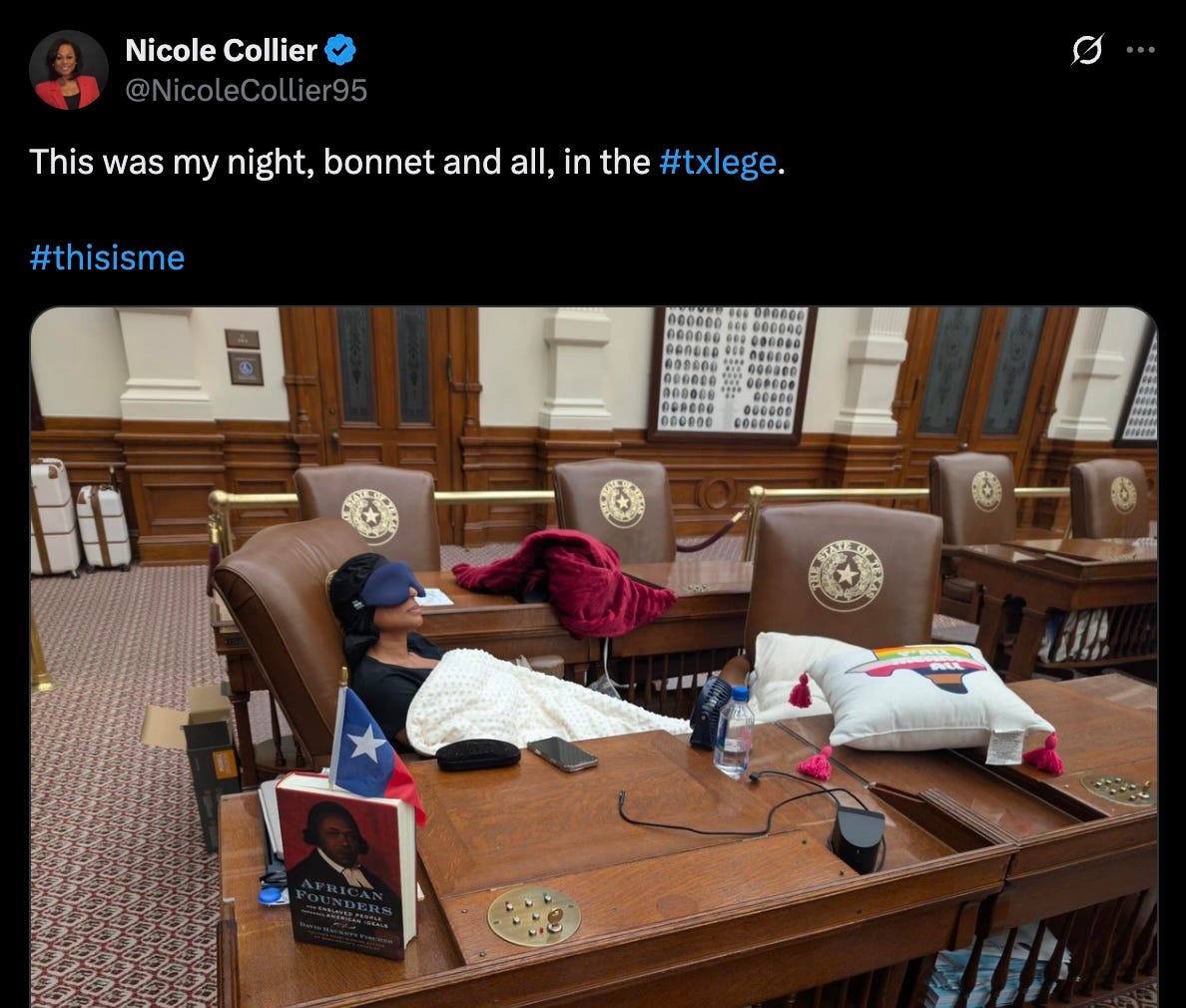 Representative Nicole Collier refused to sign what Republicans labeled a “permission slip,” granting her trooper escort. The consequence was that she confined herself to the House floor, turning her chamber desk into a bed. She posted her makeshift imprisonment to 𝕏, presenting herself as a political captive. Yet, the reality is she could have slept in her office or gone home, trooper nearby. Her supposed incarceration was voluntary, a choice staged for cameras and sympathizers.