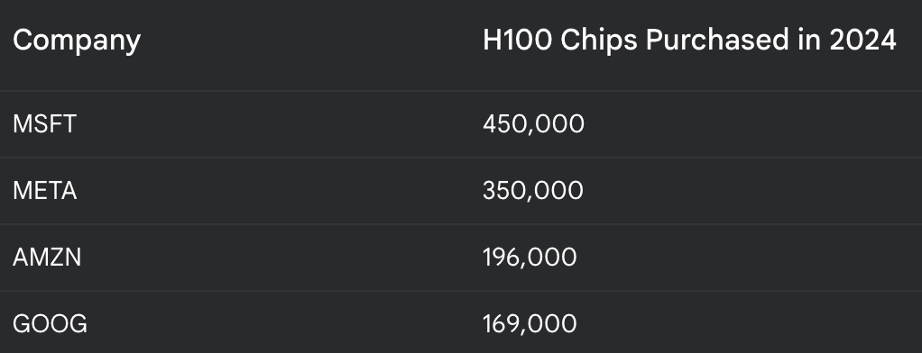 DeepSeek claims to have developed the R1 model in less than two years with only $5.6 million, using less advanced Nvidia H800 chips . This claim is particularly striking considering the significant investments made by US companies in AI development. For instance, the following table shows the number of H100 chips purchased by leading US tech companies in 2024 alone: