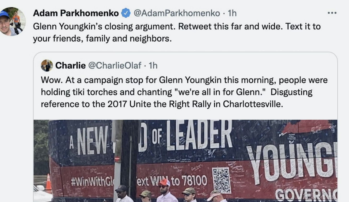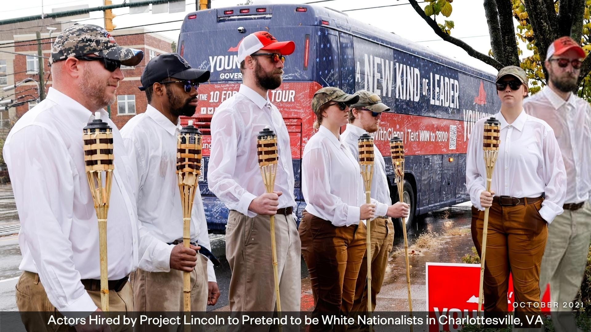 I can’t help but think the suspects wearing the red shirt were hired like the Tiki Torch white nationalists that the Lincoln Project hired to ‘support’ Glenn Younkin in Charlottesville, VA. If you don’t remember that false flag operation you can read all about it HERE. Take a look at the Tiki Torch actors and tell me that you don’t see a similarity with the red-shirted Neo-Neo-Nazis: