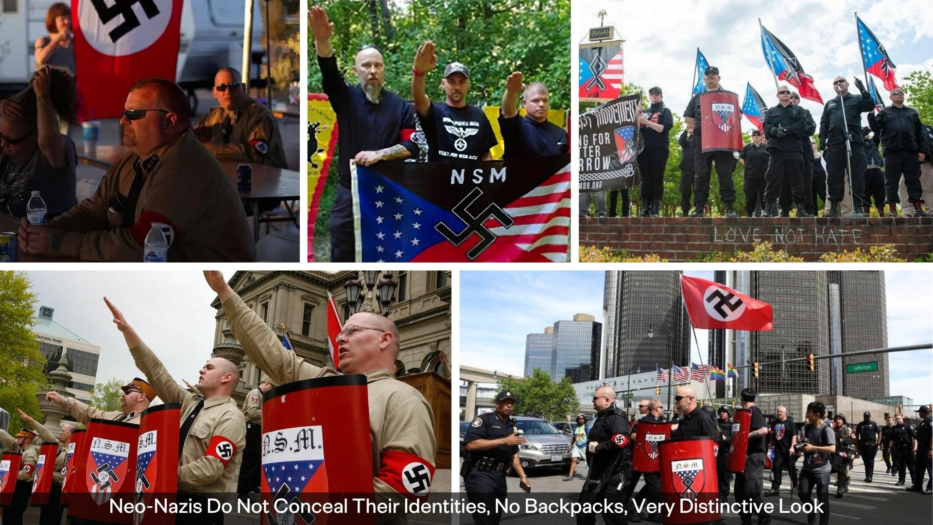 They conceal their identities by wearing masks and reflective sunglasses (Neo-Nazis do not hide their identities)