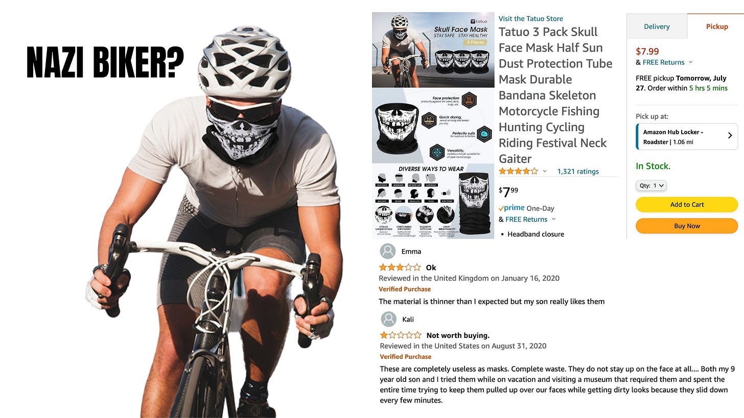 UPDATE: Several people have mentioned that Suspects No. 4 and 7 (the folks wearing the skull facemask) might be members of a group called AtomWaffen Division (AWD) as their members were known to wear the scary masks. It turns out that a LOT of people wear skull face masks as well - more than 1,000 sellers on Amazon have one or more variations of the skull face mask for sale [HERE].