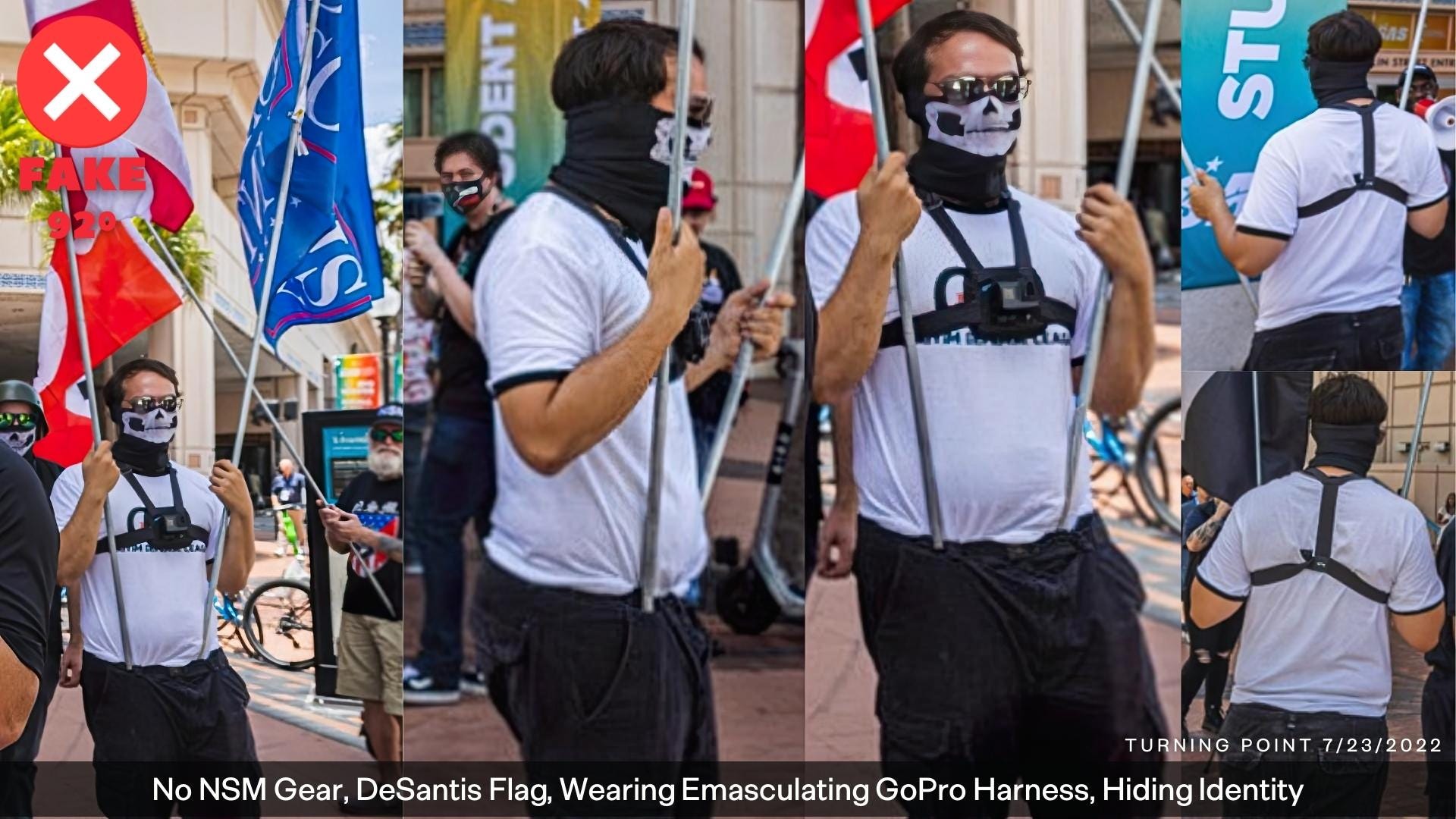 Suspect No. 10 looks like he was plucked out of the Hillsborough County Democratic office. He isn’t wearing any Nazi gear and he’s carrying both the Nazi flag and a DeSantis flag. He filmed his fellow Neo-Neo-Nazis with a GoPro camera attached to what looks like an emasculating BDSM harness. Like the rest of the Neo-Neo-Nazis Suspect No. 10 carefully conceals his identity throughout the event. He only communicates with a freelance photographer that covered the protests to position the DeSantis flag with his fellow protesters and their Nazi flags and signs. You can see below just how often the flag is captured with the various Neo-Neo-Nazis.