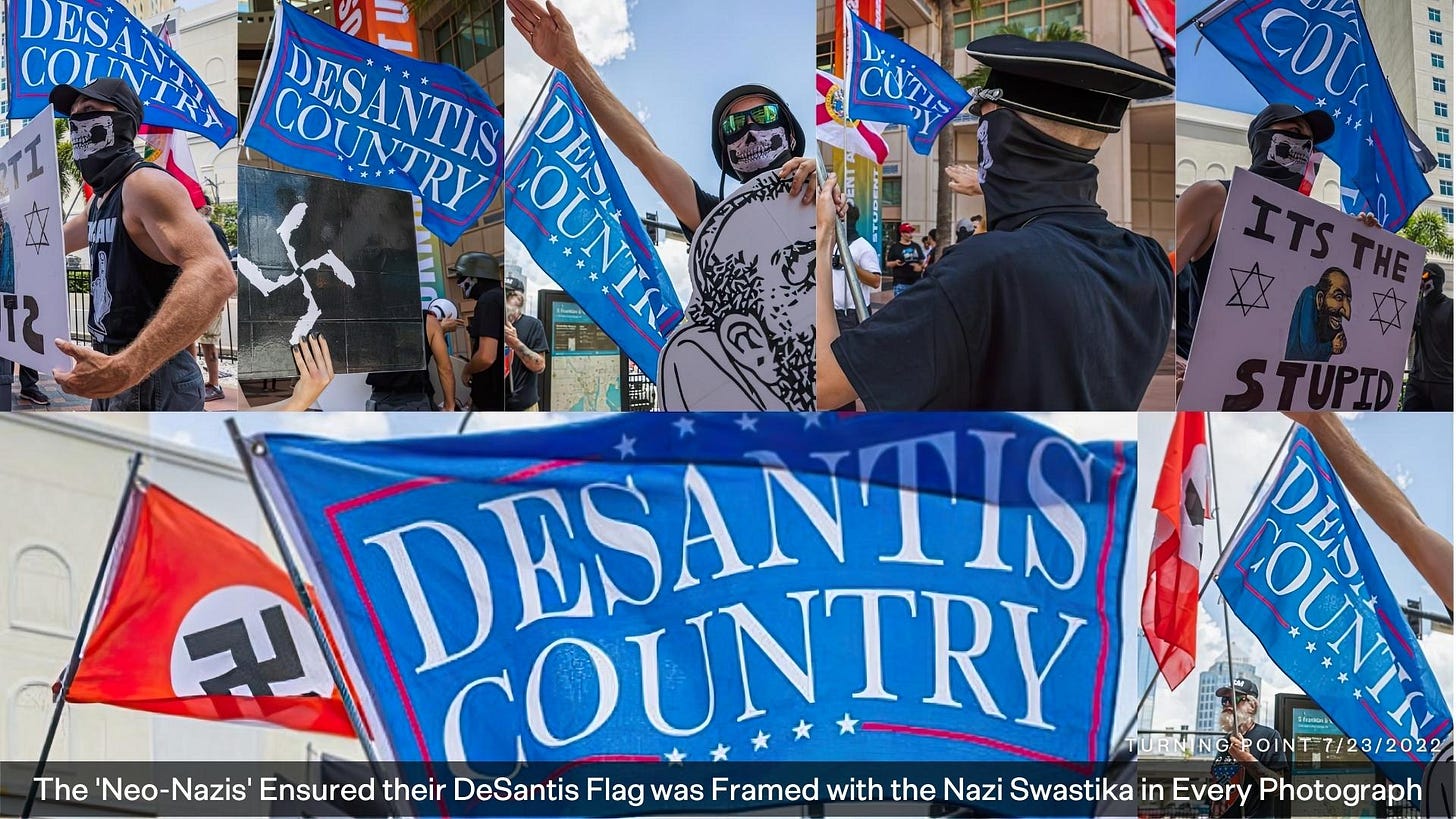 Just as Broward County Democrats began claiming DeSantis was the second coming of Hitler a bizarre phenomenon began occurring. Almost every time conservatives gather in Fort Lauderdale, Tampa, or Miami individuals, typically dressed in Black Bloc claiming to be Neo-Nazis, show up to protest carrying flags and signs emblazoned with Nazi swastikas, SS bolts, and antisemitic messages. Their protests are almost immediately covered by leftwing alternative media and quickly followed by Democratic condemnations from Charlie Crist and Nikki Fried of Governor DeSantis and other conservatives for not repudiating the protesters quickly enough.