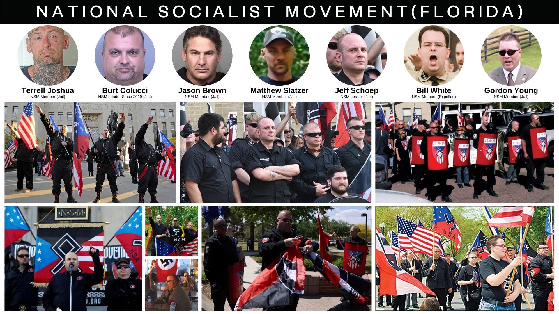 According to the Anti-Defamation League, there is one Neo-Nazi group in Florida. Based in Kissimmee the group of approximately 12-24 members has been led by Burt Colucci since 2019 and is called the National Socialists Movement (NSM).2 The ADL claims that the Neo-Nazi movement and the NSM specifically have been on the decline since 2017. Florida’s NSM is the most active Neo-Nazi group in America holding rallies across the country and livestreaming them on the American Nazi Party’s website. If you hear of a Neo-Nazi rally anywhere in the country it is almost certainly organized by Florida’s NSM. The group typically targets LGBTQs, immigrants, Jews, and the federal government - there is no history of them holding rallies for or against conservatives.