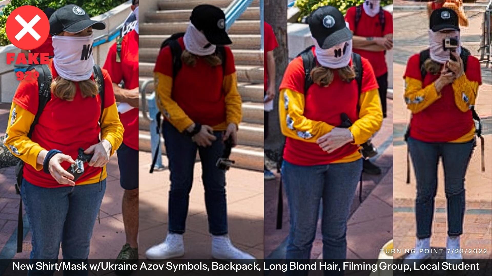 Suspect No. 2 will be our last. In various videos and photographs, it was clear she was VERY uncomfortable and nervous. She was with the suspects wearing red shirts (she is wearing the same red shirt and mask (for some reason she also wore a long sleeve yellow shirt underneath despite 92º temperatures). She also had a hat sporting the Black Sun symbol. Her presence as a woman at a Neo-Nazi event would be unlikely and like her fellow red shirt companions, she carried a college-style backpack. Finally, she was standing back with a handheld gimble-mounted GoPro filming her comrades - something real Neo-Nazis never do. It would be one thing if she was filming counter-protesters threatening her friends but in this case, she was filming their protest as if it was a performance.