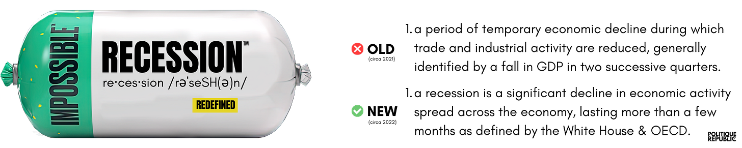 Since the United States began releasing quarterly economic data in 1947 each time nominal GDP has declined in two successive quarters the NBER has determined the economy was in recession - and there is no doubt that they will do the same a year from now. Despite what the Biden administration would have you believe the ‘definition’ of a recession has not changed - they’re simply trying to avoid calling this recession a recession until AFTER the midterm elections.