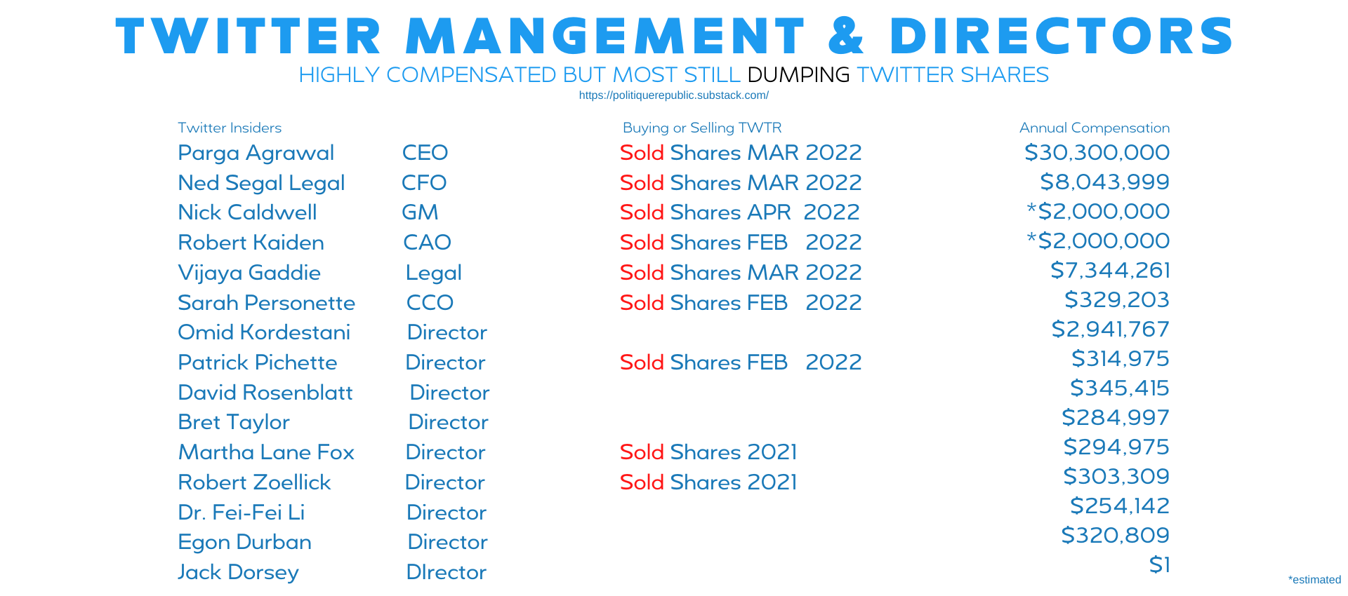 Gordon Gecko cuts right to the heart of the matter - the interests of Twitter’s management team and directors are not aligned with those of their shareholders. Agrawal owns less than .06% of Twitter and he’s so confident in his leadership that rather than buying more Twitter shares he’s selling them. So why would he want to stop Elon from buying any more shares (especially since doing so increases the company’s value)? The answer is simple - he doesn’t want to lose his cushy $30M/YR job - full stop.