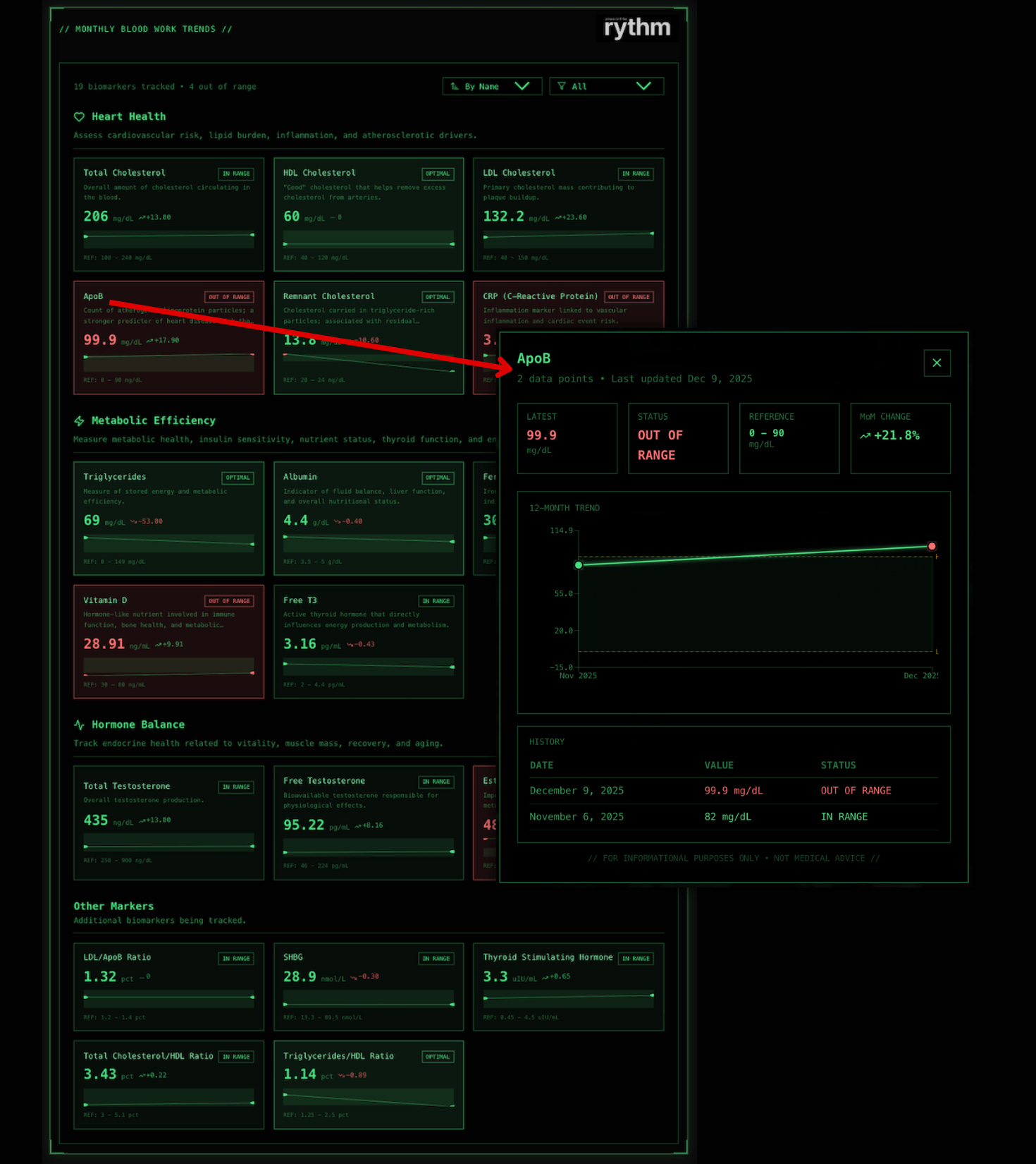 My dashboard is connected to my monthly blood work provided by Rythm. It only has two months so far (Nov-Dec) but will continue to be updated monthly. January should be live in a few days.