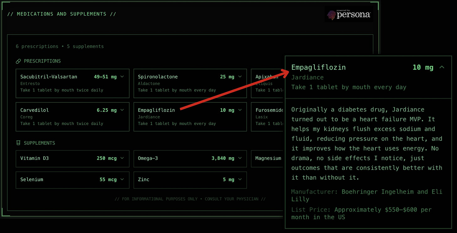 The dashboard also includes my current medications and supplements including maker and cost. This section will be evolving as well.