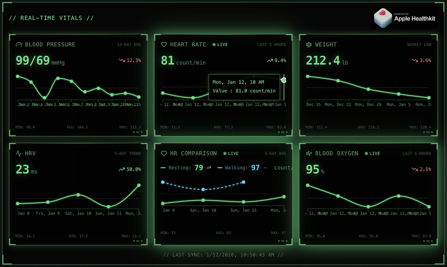 My health dashboard connects to my Apple Watch via Healthkit. Right now I only have it showing blood pressure, heart rate (live), weight, HRV, resting/walking HR (live), and blood oxygen levels (live). I'll be adding in activity data soon.