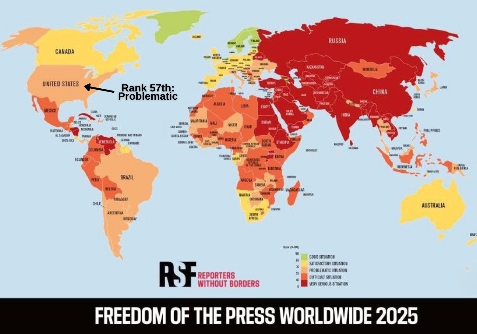 Yet much of what Europe calls hate speech is precisely the sort of political expression that the First Amendment protects. Criticizing illegal immigration in sharp, even harsh terms. Mocking or satirizing religious figures, including Mohammed. Rejecting or ridiculing transgender ideology, including the practice of insisting on biological pronouns. Arguing that certain protected minorities receive unjustified privileges, or that immigration has damaged national culture. In Germany, France, the UK and other states, citizens have been investigated, fined, and even jailed for exactly these kinds of statements, often posted online. The US Supreme Court has made clear that there is no hate speech exception to the First Amendment. The worst and most offensive opinions are still protected from criminal punishment. The contrast is not subtle. Yet in the RSF index, the European states that outlaw these opinions are painted bright green while the US, which protects them, is colored orange.
