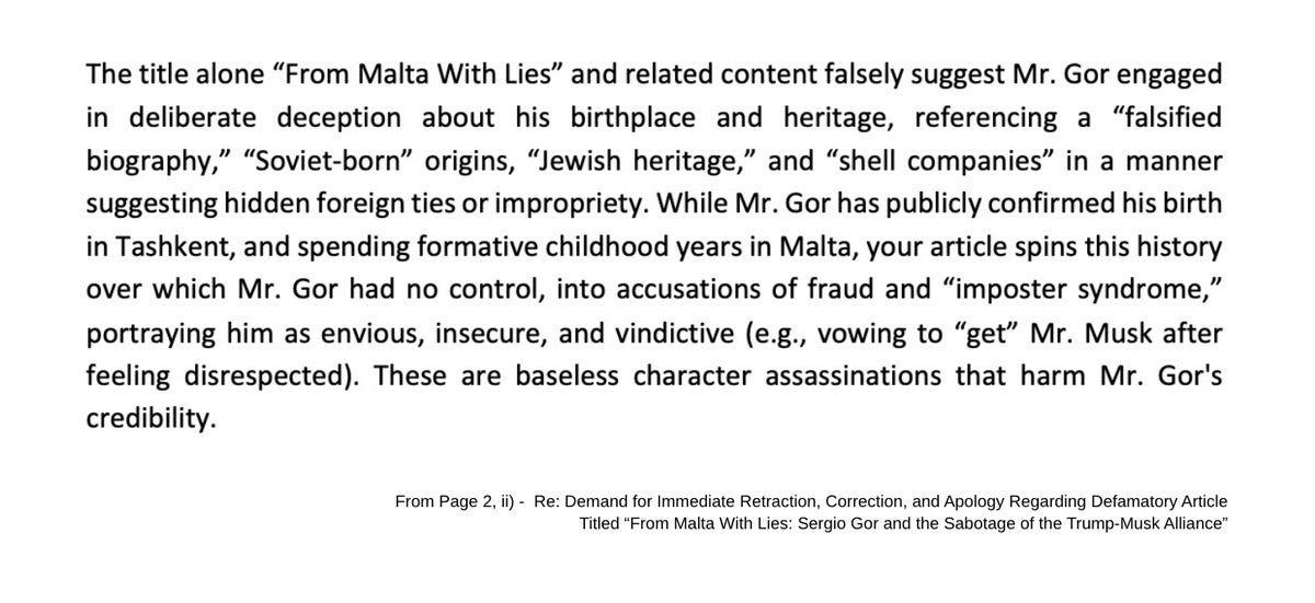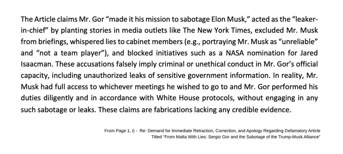 My op-ed doesn’t allege otherwise. In short, the core thesis of my piece, that Sergio Gor engineered the implosion of a historic alliance between Trump and Musk, isn’t just supported by evidence. It’s already a matter of public record. If Gor’s lawyer believes he can litigate his way out of the facts, he’s welcome to try (I hope he does not). But the courtroom is not a safe space for bruised egos and wounded pride.