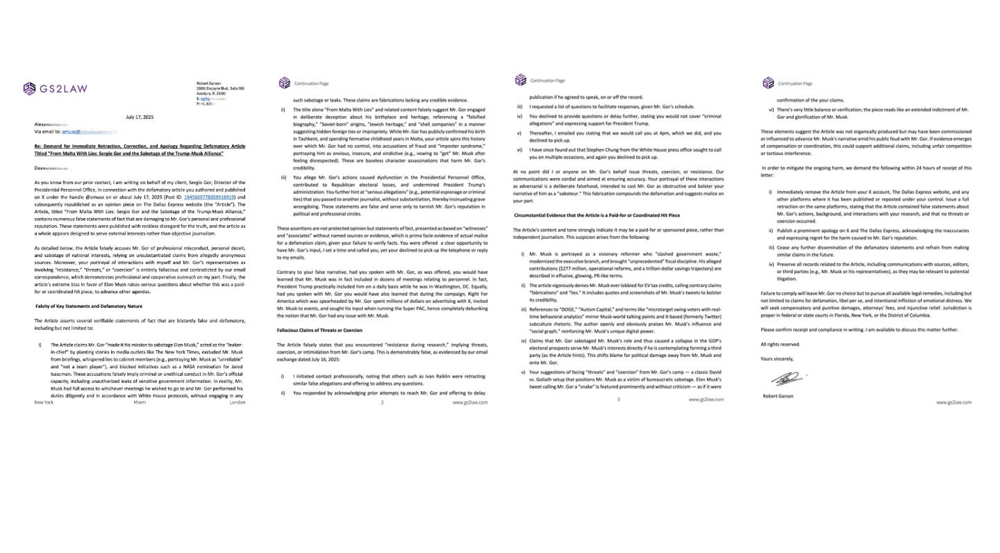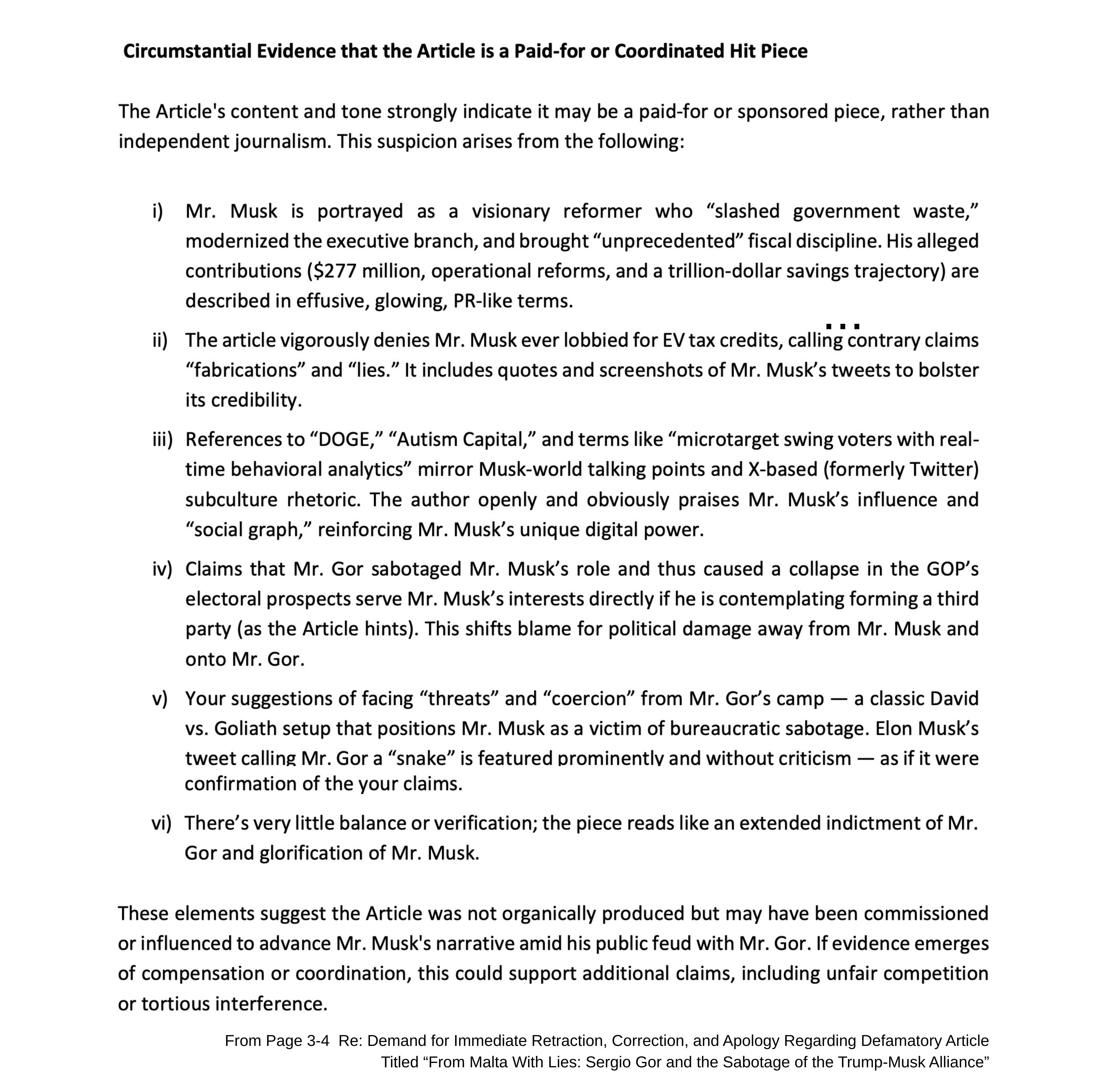 Gor’s lawyer closes his demand letter with a final flourish of paranoia, suggesting that my op-ed wasn’t independent journalism at all, but some kind of paid-for or sponsored piece. His “evidence”? That I respect Elon Musk. That I embedded X posts in the piece. And that the op-ed indicts Sergio Gor while praising Musk.