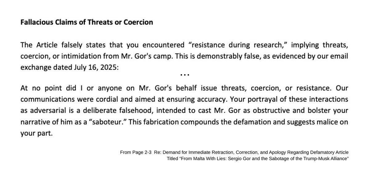When I contacted Sergio Gor for comment, he didn’t call me back. Instead, I heard from his attorney. I took that response, understandably I think, as threatening. That’s my opinion, and, frankly, the fact that I was met with a legal threat instead of a conversation only reinforces the very point I was making. It confirms that my sense of being threatened was not only justified, it was accurate.