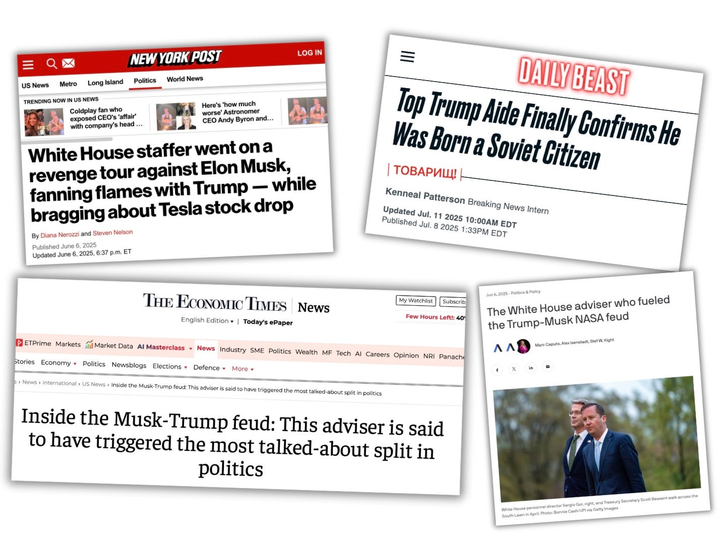 Then there’s The New York Post, where reporters Diana Glebova Nerozzi and Steven Nelson published a June 6 exposé titled “White House staffer went on a revenge tour against Elon Musk, fanning flames with Trump, while bragging about Tesla stock drop.” It describes Gor “harboring a personal grudge” after being humiliated by Musk, celebrating Tesla’s declining stock price, and actively lobbying Trump to kill the Isaacman nomination.