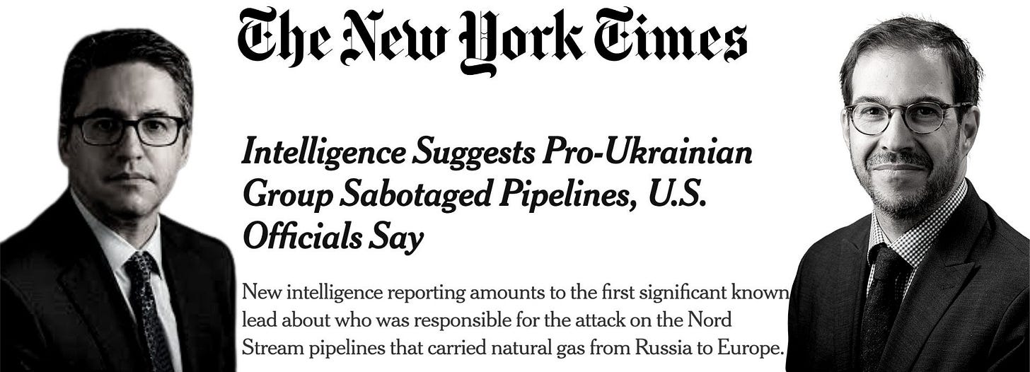 Shortly after the terror attack on the Nord Stream pipeline the White House delivered talking points to the media falsely blaming Russia for destroying their own pipeline—accusations that Russia called “stupid” and “absurd”.3 Talking points the administration has since abandoned. After Seymour Hersh’s bombshell reporting the decision was made to have US intelligence officials share a new ‘alternative theory’ with sympathetic reporters from the New York Times.