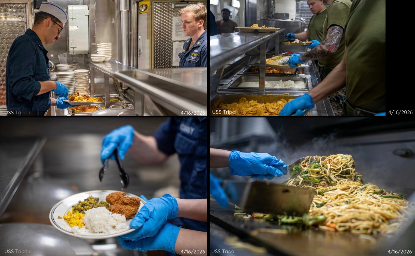 USS Tripoli is an America-class amphibious assault ship. It is not a carrier in the flight-deck sense, but its food service architecture follows the same doctrinal framework. The ship supports a crew and embarked Marines, operating a galley system built around the same mandatory recipe standards, the same cycle menus, the same nutritional requirements, and the same resupply architecture through the combat logistics force. Amphibious ready groups operate in close coordination with carrier strike groups precisely because logistical support, including food, fuel, and ammunition, is shared across the task force. The notion that Tripoli was running short on food while operating as part of a task force executing a major named operation, with NavCent monitoring daily logistics stats for every ship in the theater, is a claim that would require the simultaneous failure of the shipโs own supply chain, the task force logistics system, NavCentโs oversight function, and the Secretary of Defenseโs team, all without anyone noticing until a Ukrainian ๐ account posted a photograph that turned out to be from the Iran-Iraq war. The probability of that coincidence is not something a serious person should accept.