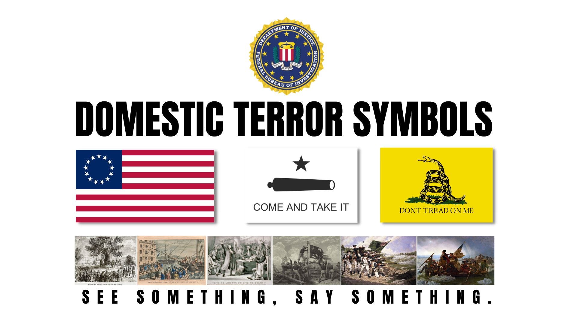 The FBI's classification of traditional patriotic symbols as 'Domestic Terror Symbols' allows them to secure search warrants and wiretaps on conservatives. Flying the Betsy Ross Flag, Gonzales Battle Flag, or Gadsden Flag provides the FBI with probable cause that you're a dangerous domestic terrorist.