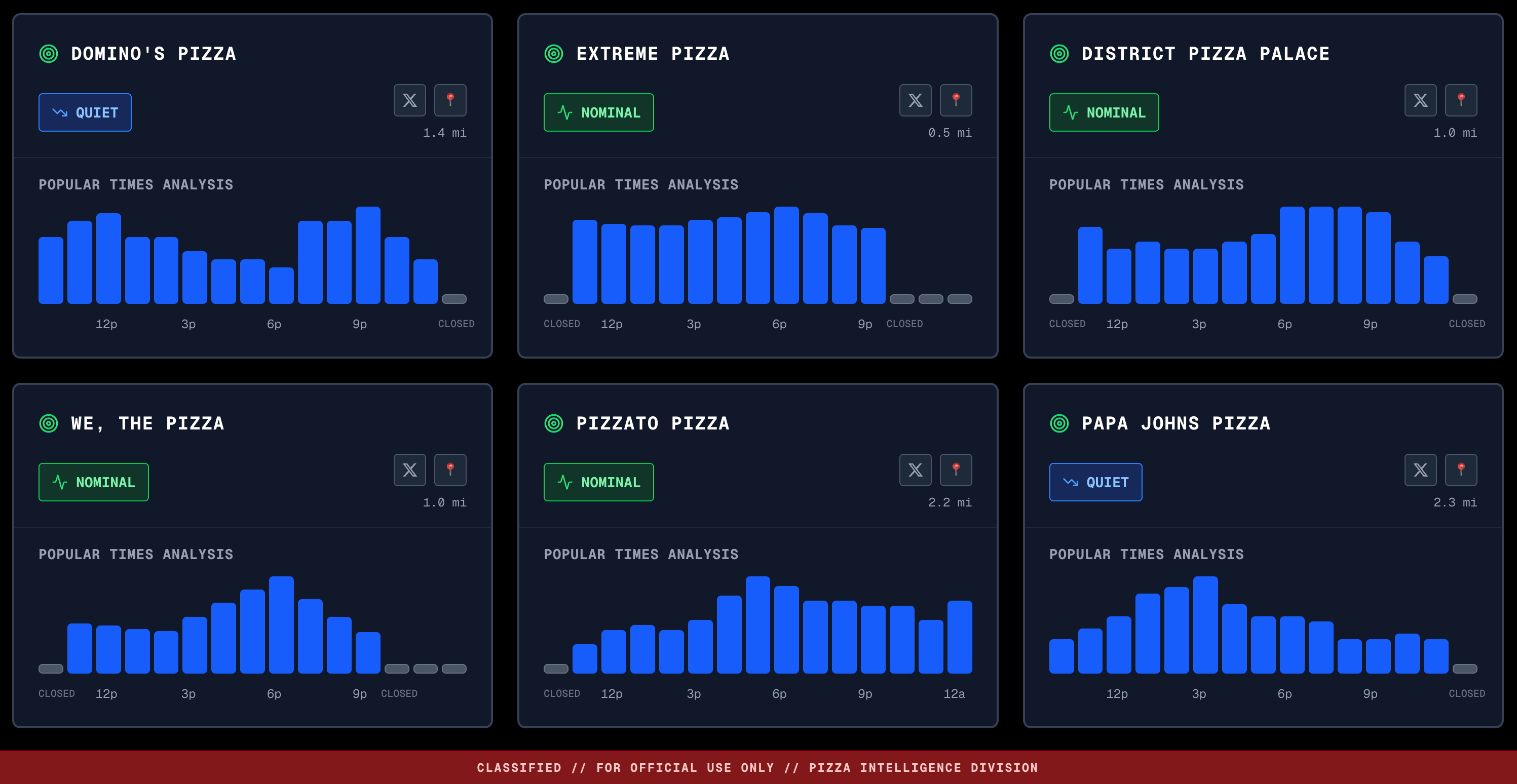 Still, the persistence of the pizza index illustrates a broader truth about the OSINT age: once an unconventional indicator becomes widely known, it attracts attention and spawns new layers of interpretation. Social media accounts have turned it into entertainment, but also into a form of public engagement with intelligence gathering. The pizza trackers reflect both the creativity and the limits of crowdsourced analysis. They remind us that intelligence can come from unexpected places, yet they also demonstrate the risks of overinterpretation. The Pentagon may never be fully free of people watching its pizza habits, but the cat-and-mouse game ensures that any real value will diminish over time.
