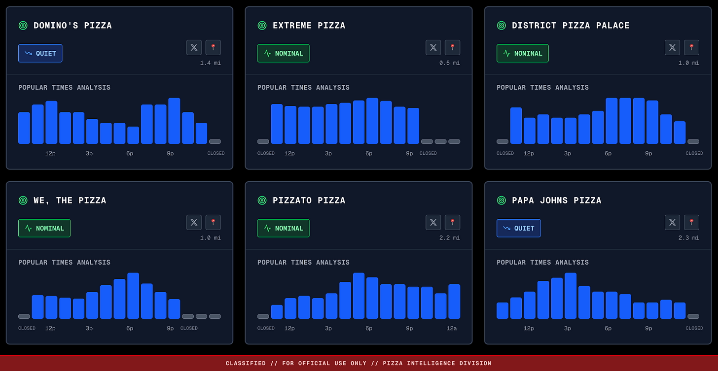 Officials have also taken steps to blunt the signal. Accounts of Operation Neptune Spear, the 2011 raid on Osama bin Laden, indicate that catering orders were deliberately staggered across different vendors to avoid creating a telltale surge. The growth of delivery apps and a broader range of late-night dining options further dilutes the reliability of pizza data. Pentagon staff working through the night might order sushi, wraps, or salads, fragmenting the food trail in ways that make simple pizza monitoring less effective.