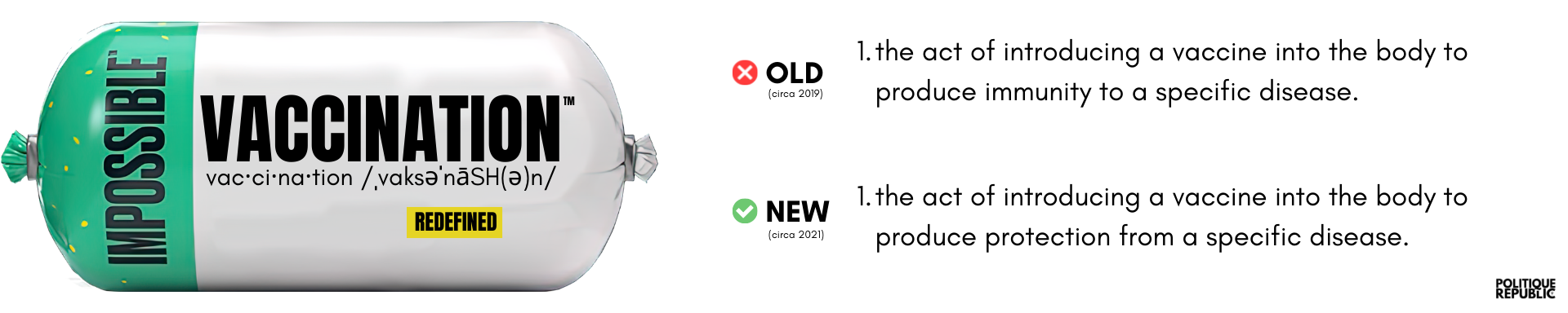 Before the change, the definition for “vaccination” read, “the act of introducing a vaccine into the body to produce immunity to a specific disease.” Now, the word “immunity” has been switched to “protection.” The term “vaccine” also got a makeover. The CDC’s definition changed from “a product that stimulates a person’s immune system to produce immunity to a specific disease” to the current “a preparation that is used to stimulate the body’s immune response against diseases.”11