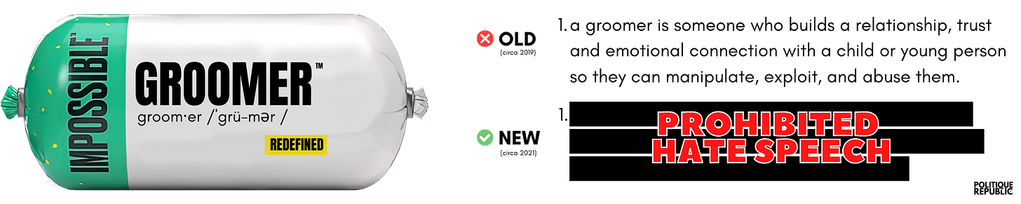 For decades organizations like the Boy Scouts have required adult leaders to take youth protection courses to help them identify and eliminate groomers from their ranks.12 Recently the progressive left has successfully convinced Big Tech to redefine the label as ‘hate speech’ specifically targeting gay and transgender people. As a result, the word is banned, censored, or suppressed on various platforms like Twitter, Facebook, and Reddit.