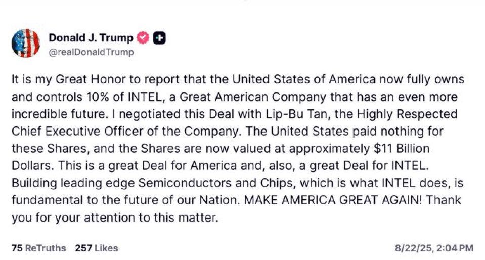 There is a deeper philosophical point here. In capitalism, risk and reward are supposed to go together. Private investors risk capital and reap profits when they succeed. When the government acts as investor of last resort, as it did in the financial crisis and again with the CHIPS Act, it assumes risk on behalf of the public. To deny taxpayers the corresponding chance at reward is a violation of that basic principle. Trump’s golden share policy restores balance. It puts the public back in its rightful place as a stakeholder, not merely a donor.