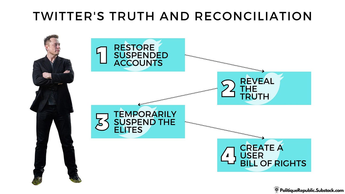 I can’t help but wonder if the process Elon Musk is taking Twitter through has been influenced by the process of truth and reconciliation1 South Africa went through in the 1990s. The billionaire was born and raised in Pretoria, South Africa, and is no doubt very familiar with the commission chaired by Desmond Tutu. South Africa’s Truth and Reconciliation Commission was crucial in the nation’s transition to full and free democracy—could Elon Musk be taking a page from Nelson Mandela at Twitter?2