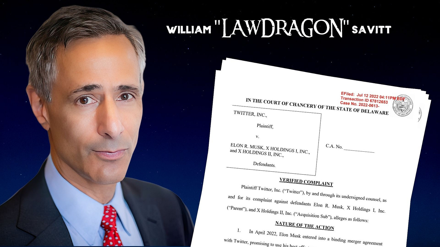 Eleven minutes after the market closed today Peter Walsh, Jr. filed a 62-page complaint1 on behalf of William “LawDragon” Savitt2, against Elon Musk and the shell companies he formed to sign the Merger Agreement with Twitter. Savitt’s prayer for relief was simple - the court should order Elon Musk to buy Twitter.3