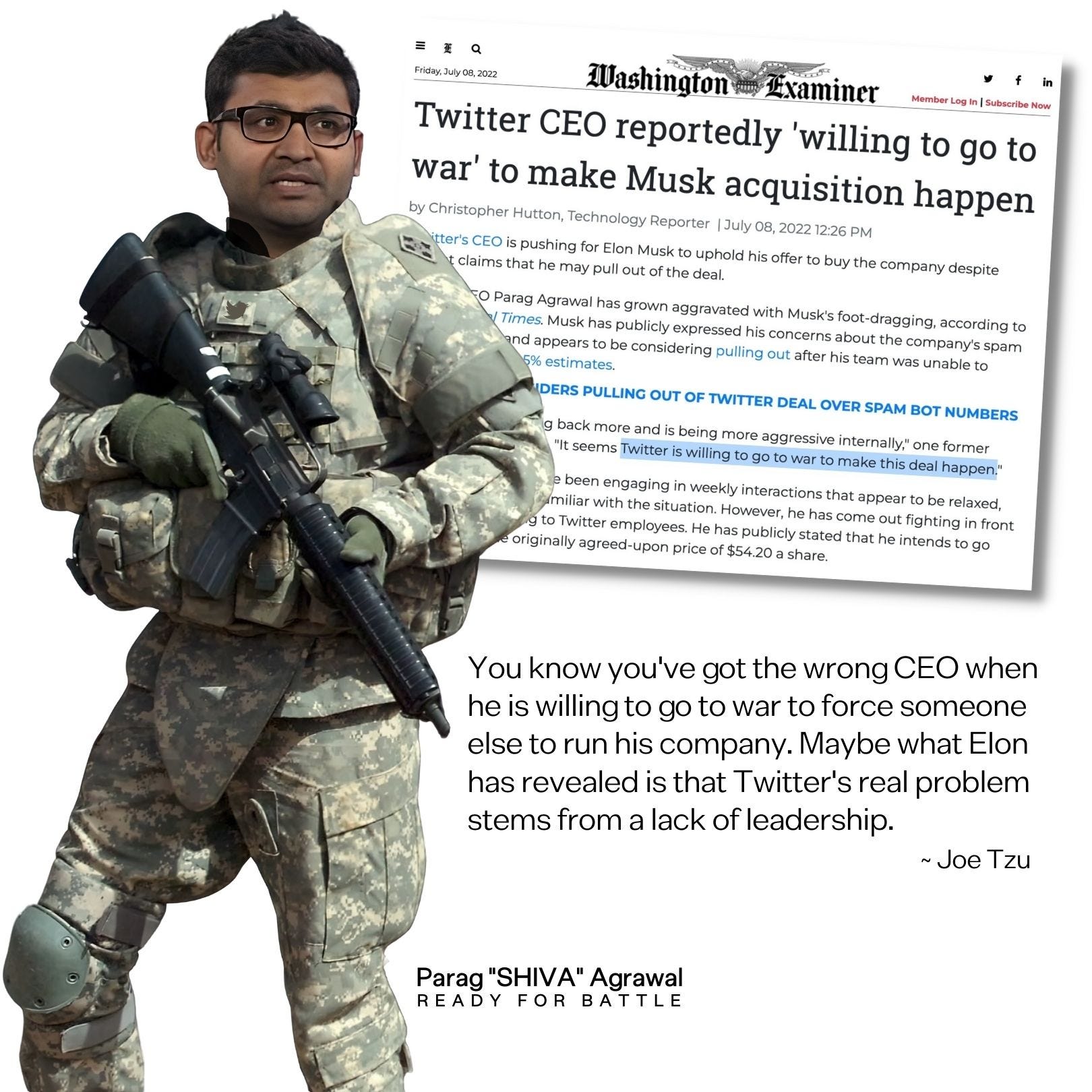 UPDATE: Parag Agrawal, Twitter’s CEO, is reported to have stated that he’s “willing to go to war to make this deal happen.”1 You know you've got the wrong CEO when he is willing to go to war to force someone else to run his company. Maybe what Elon has revealed is that Twitter's real problem stems from a lack of leadership.