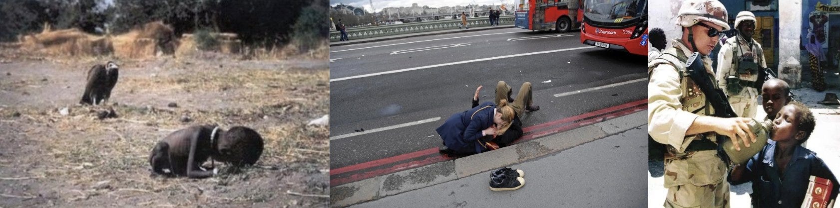 First Image: Kevin Carter – Sudan Famine (1993), Second Image: Umar Abbasi – London Bridge Terror Attack (2017), Third Image: Dan Eldon – Somalia (1993)